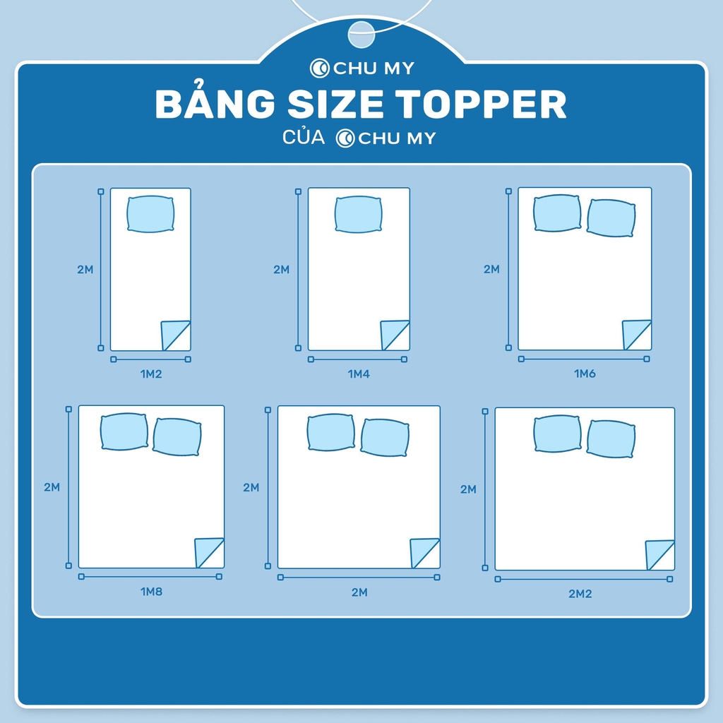 Gợi ý: Nếu topper mới mở từ bao bì nén, nên để topper ổn định trong phòng thoáng một thời gian để đạt độ phồng tự nhiên trước khi dùng.