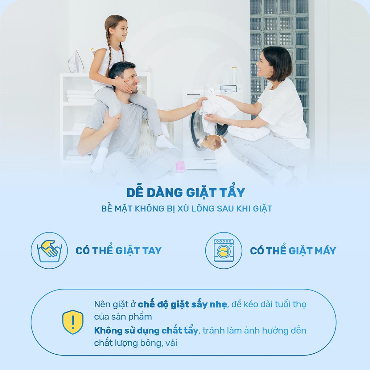 Có thể giặt bằng tay hoặc bằng máy đều được. Không sử dụng chất tẩy hay chế độ giặt sấy quá mạnh. Tránh làm ảnh hưởng đến chất lượng bông, vải.