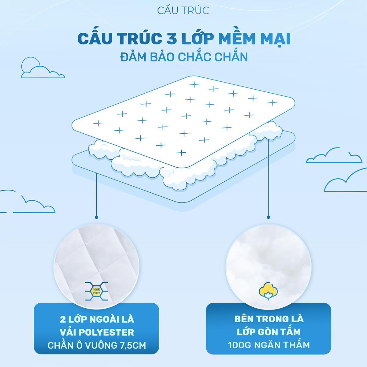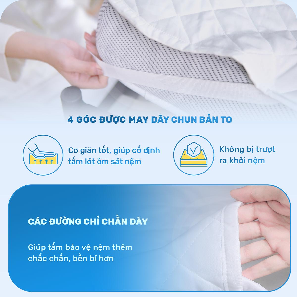 Cấu trúc 3 lớp: 2 lớp ngoài là vải Poly cao cấp, bên trong là lớp gòn bông được chần ô vuông 7,5cm. Các đường chỉ chần dày giúp tấm bảo vệ nệm thêm chắc chắn, bền bỉ hơn. 4 góc được may dây chun bản to, co giãn tốt, giúp cố định, giữ chặt tấm lót ôm sát nệm. Khiến tấm lót không trượt ra khỏi nệm.