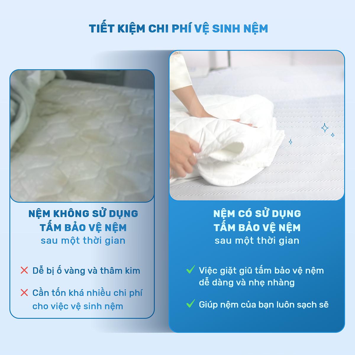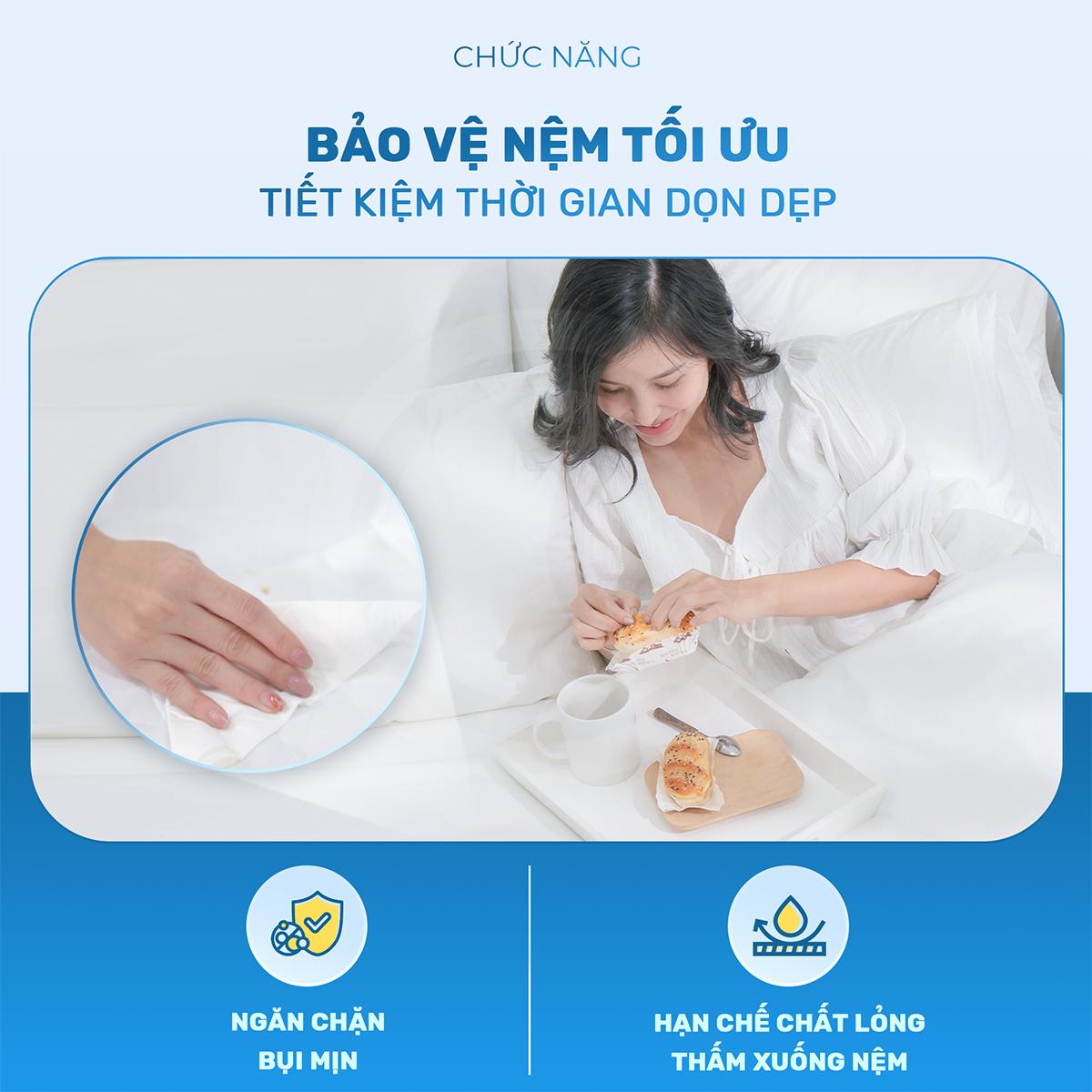 Mặc dù trên tấm nệm của bạn lúc nào cũng sử dụng ga trải giường nhưng thông thường ga trải giường khá mỏng. Mồ hôi, tế bào chết trên da, bụi mịn vẫn có thể len lỏi qua và bám vào làm bẩn nệm. Tấm bảo vệ đệm có thể hoàn toàn ngăn được các loại bụi bẩn,ngăn chặn mồ hôi. Và kể cả khi bạn có sở thích ăn sáng, ăn vặt trên giường, vô tình làm đổ nước lên giường thì tấm bảo vệ nệm cũng ngăn nước thấm xuống nệm, giúp bạn có đủ thời gian dọn dẹp, vệ sinh mà không làm ảnh hưởng tới nệm.