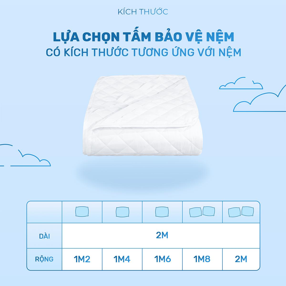 Lựa chọn tấm bảo vệ nệm có kích thước tương ứng với nệm. Kích thước tiêu chuẩn: 1m2x2m; 1m4x2m; 1m6x2m; 1m8x2m; 2mx2m