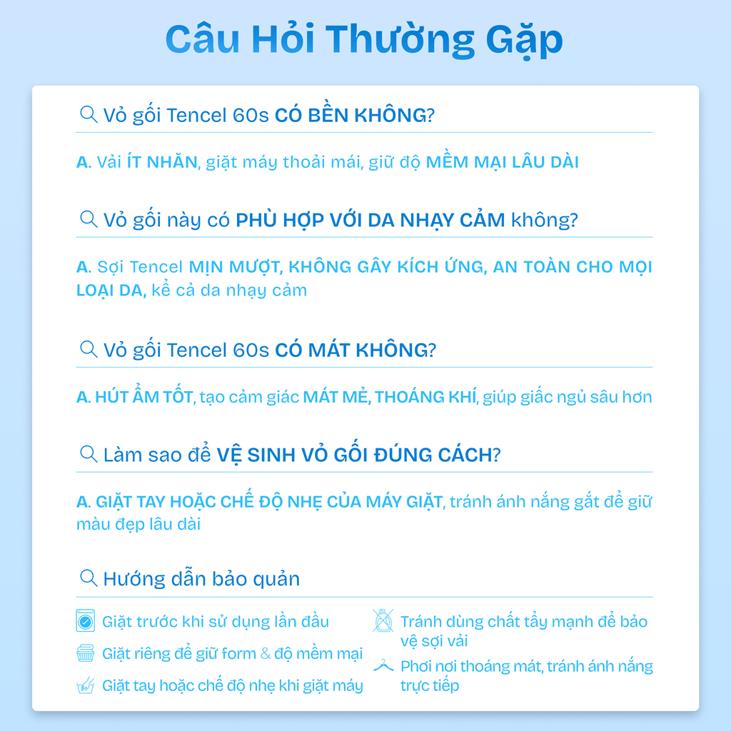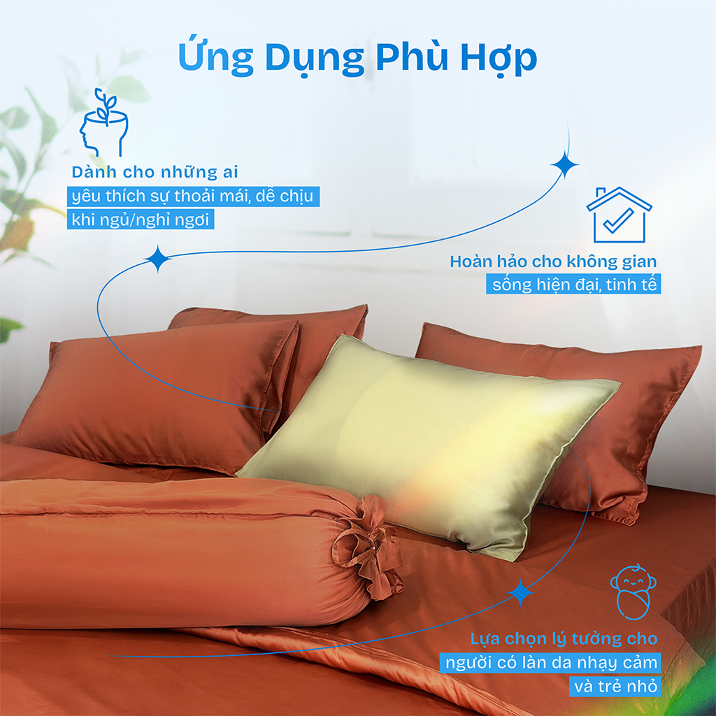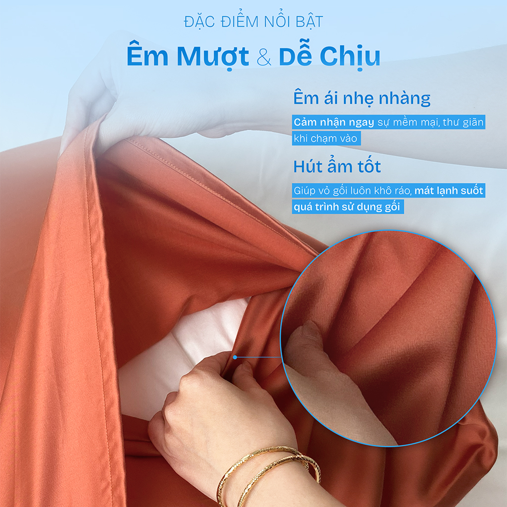 Bảo vệ da: Đây là lựa chọn lý tưởng cho da nhạy cảm. Vải Tencel giúp giảm nếp nhăn do cọ xát, giữ cho làn da mặt được mịn màng hơn khi ngủ.