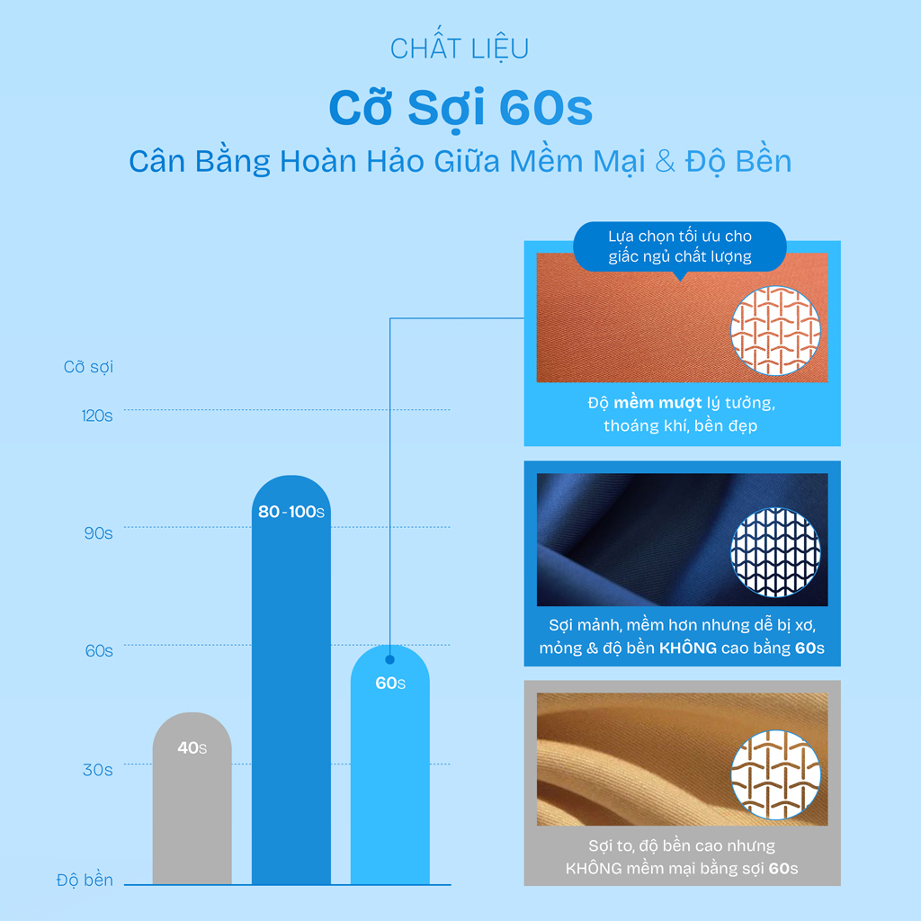 Cảm giác chạm đầu tiên: Chất vải Tencel 60s siêu mềm, mang lại cảm giác êm ái, mượt mà như lụa, giúp bạn thư giãn tức thì ngay khi đặt lưng.